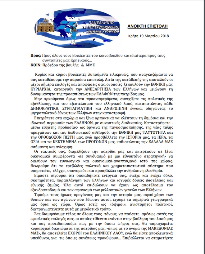 νέα επιστολή, στο κλίμα της χθεσινής που έστειλε η Παμμακεδονική Ενωση,