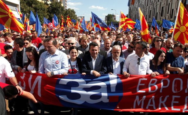 Στιγμιότυπο από συγκέντρωση στα Σκόπια υπέρ του «Ναι» στο δημοψήφισμα, με επικεφαλής τον Ζόραν Ζάεφ (κέντρο, φωτογραφία από AP).