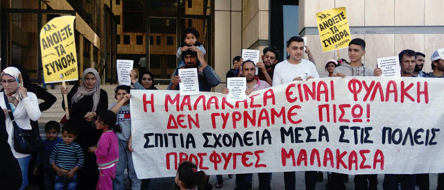 Καταγγέλλουν ότι η «Μαλακάσα είναι φυλακή» και πως δεν γυρίζουν πίσω. «Θέλουμε σπίτια και σχολεία μέσα στις πόλεις» είναι σύνθημα των «πλακ ατ» που κρατούν οι γυναίκες πρόσφυγες.