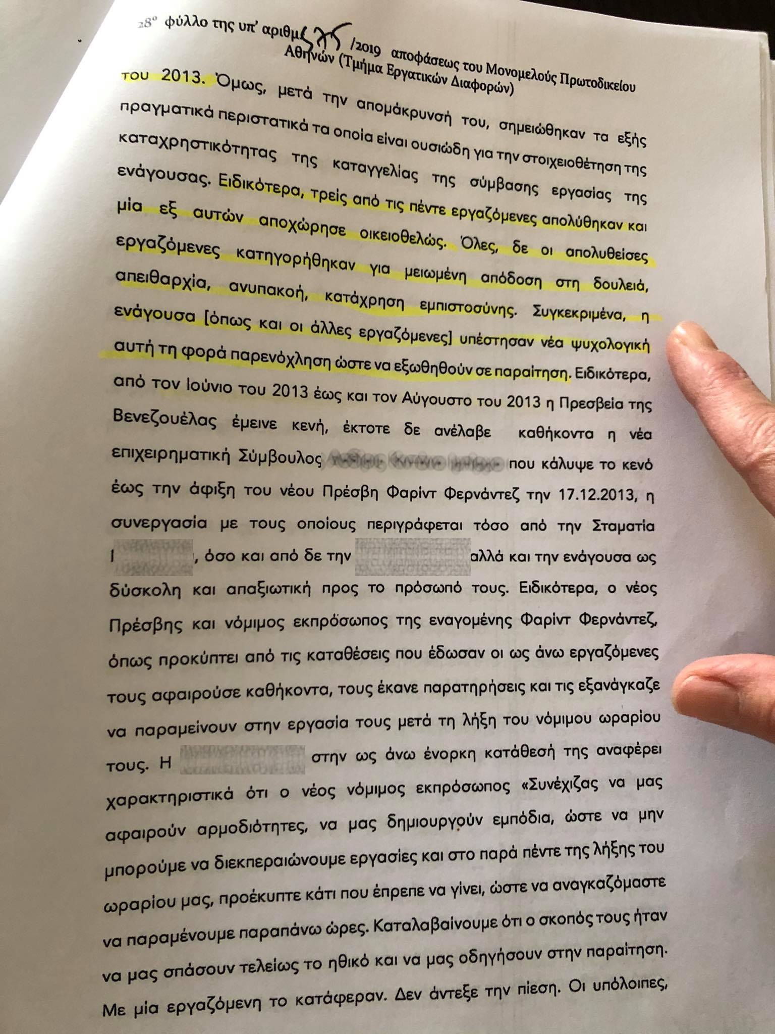 Οι πέντε Ελληνίδες υπήρξαν θύματα σεξουαλικής παρενόχλησης από πρέσβη της Βενεζουέλας στην Αθήνα και στο χρονικό διάστημα από τον Οκτώβριο του 2012 έως τον Ιούνιο του 2013. Η μία παρέμεινε στο πόστο της, η μία αναγκάστηκε σε παραίτηση, ενώ οι υπόλοιπες τρεις απολύθηκαν. Οι δύο από τις τρεις απολυμένες, η Ξένια Μπουζαρανίδου και η Σταματία Μ. βρήκαν τη δύναμη και το θάρρος να κινηθούν νομικά και στην Ελλάδα. Η Ξένια δικαιώθηκε με απόφαση που εκδόθηκε το Μάρτιο του 2019. Ωστόσο μέχρι σήμερα η απόφαση δεν έχει εκτελεστεί, καθώς το ελληνικό υπουργείο Εξωτερικών δεν υπογράφει για ν’ αποζημιωθεί. Η υπόθεση της Σταματίας Μ. δεν έχει εκδικαστεί κι έχει πάρει αναβολές εξαιτίας της πανδημίας.