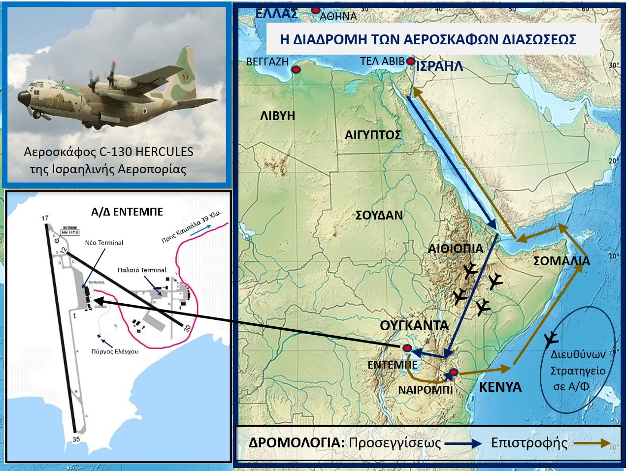 Την 15:30 της 4ης Ιουλίου, 4 αεροσκάφη C-130 HERCULES (ΗΡΑΚΛΗΣ)[10] με 200 καταδρομείς και στρατιώτες πεζικού υπό την διοίκηση του τριαντάχρονου Αντισυνταγματάρχου Γιονατάν Νετανιάχου[11] (1946-1976) [(μεγαλύτερο αδελφό του σημερινού πρωθυπουργού του Ισραήλ Μπέντζαμιν Νετανάχιου (1949)], απογειώθηκαν από το νοτιότερο άκρο της χερσονήσου του Σινά με προορισμό το Eντέμπε. Τα αεροπλάνα πέταξαν σε ύψος 30 μέτρων πάνω από την Ερυθρά Θάλασσα, για να μην εντοπισθούν από τα ραντάρ της Αιγύπτου, της Αιθιοπίας και του Σουδάν. Η όλη διεύθυνση της επιχειρήσεως ανατέθηκε στον Υποστράτηγο Σομρόν, επικεφαλής του προκεχωρημένου στρατηγείου, το οποίο επιβιβάσθηκε σε ένα αεροσκάφος BOEING 707. Ένα επιπλέον C-130 με πλήρη νοσοκομειακό εξοπλισμό προσγειώθηκε στο Ναϊρόμπι (Κένυα) για την παροχή αμέσου υγειονομικής περιθάλψεως. Μετά από επτάωρη πτήση το πρώτο C-130, πετώντας σε απόσταση αναπνοής πίσω από ένα βρετανικό εμπορικό αεροσκάφος, για να μην εμφανίζεται το ίχνος του στο ραντάρ, προσγειώθηκε στο Eντέμπε χωρίς να γίνει αντιληπτό από το πύργο ελέγχου.