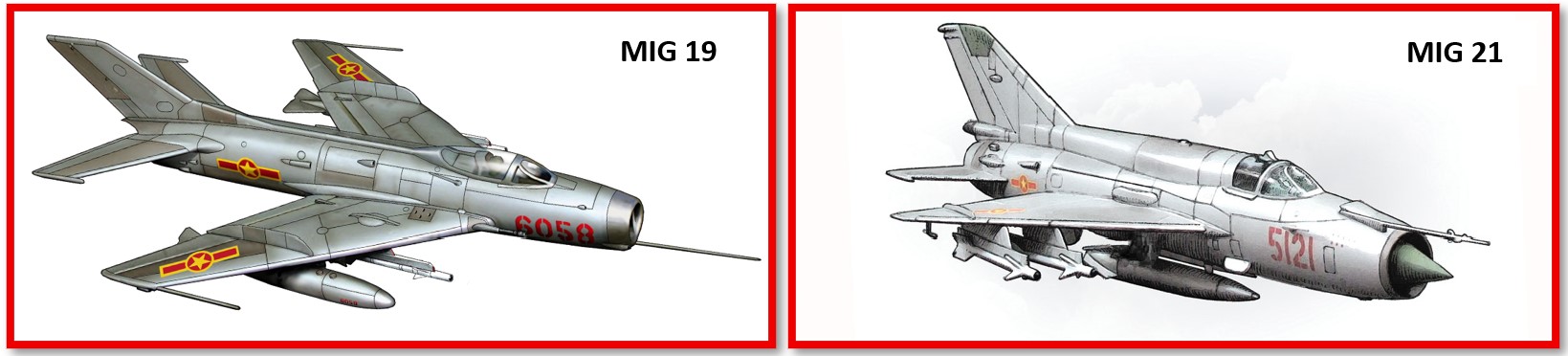 [13] Το MIG 19 είναι σοβιετικό αεριωθούμενο μαχητικό δευτέρας γενεάς. Πρώτη πτήση το 1954. Μέγιστη ταχύτητα: 1.452 χλμ./ώρα (902 μίλια/ώρα, 784 κόμβοι), 1,35 Mach στα 10.000 μ. Εμβέλεια: 1.390 χλμ (860 μ, 750 νμ). Κατασκευάσθηκαν συνολικά άνω των 12.500 μονάδων. Το MIG 21 είναι σοβιετικό αεριωθούμενο μαχητικό και αναχαιτήσεως δευτέρας γενεάς. Πρώτη πτήση το 1955. Μέγιστη ταχύτητα: 2,175 χλμ./ώρα (1,351 μίλια/ώρα, 1.174 κόμβοι), 2,05 Mach στα 10.000 μ. Εμβέλεια: 793 χλμ (490 μ). Κατασκευάσθηκαν συνολικά άνω των 11.000 μονάδων